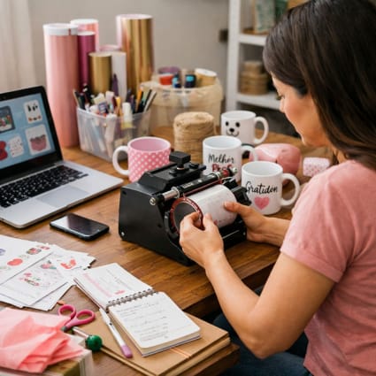 Eu ensino artesãs que trabalham com canecas personalizadas a organizarem a forma como vendem dentro do próprio ateliê.